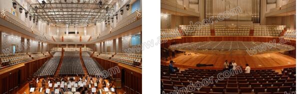 圖4、1大劇院音樂廳的全景照片 圖4、2音樂廳內(nèi)玻璃體反聲罩在調(diào)試中照片