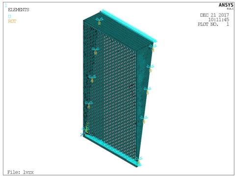 模型采用SHELL181單元建立面板,邊界條件上下邊簡支,左右兩側(cè)采用點(diǎn)支承。模型如下圖所示。