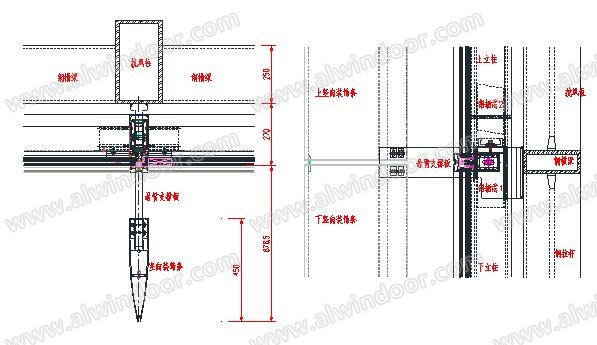 幕墻鋁結(jié)構(gòu)系統(tǒng):本項(xiàng)目通過內(nèi)層鋼結(jié)構(gòu)體系提供了幕墻2.4米或3.6米的正?缍鹊闹谓Y(jié)構(gòu),有效控制了幕墻鋁立柱的截面尺寸。立面高度方向基本模數(shù)為1.2米,由此形成了3.6x1.2米基本模數(shù)的網(wǎng)格立面。本項(xiàng)目幕墻的特點(diǎn)在于一是豎向有懸挑650mm的大裝飾條,二是水平分格達(dá)3.6米,三是裝飾條支撐板與幕墻轉(zhuǎn)接一體化,且都位于幕墻十字分縫處,整個(gè)系統(tǒng)最大的難度在于要在十字分縫的一個(gè)點(diǎn)上實(shí)現(xiàn)裝飾條及幕墻荷載的傳遞,立柱的進(jìn)出調(diào)節(jié),橫豎構(gòu)件的連接,并且所有構(gòu)造隱蔽,構(gòu)件盡可能精致小巧。