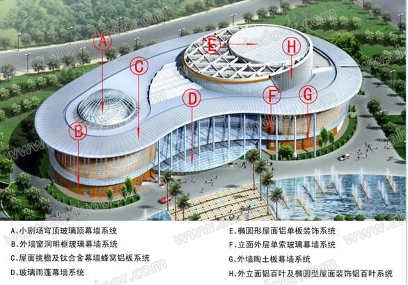 常州大劇院建筑幕墻工程幕墻面積約為43000平方米,按幕墻形式區(qū)分主要為陶土板幕墻系統(tǒng)、傾斜式不銹鋼單向索承玻璃幕墻系統(tǒng)、隱框玻璃采光穹頂幕墻系統(tǒng)、全玻幕墻系統(tǒng)、鈦合金蜂窩鋁板幕墻系統(tǒng)、肋點式玻璃幕墻系統(tǒng)、隱框窗玻璃幕墻系統(tǒng)、橢圓形單層鋁板屋面(詞條“鋁板屋面”由行業(yè)大百科提供)幕墻系統(tǒng)、蜂窩鋁板挑檐幕墻系統(tǒng)、點式玻璃雨蓬系統(tǒng)等(圖2)。