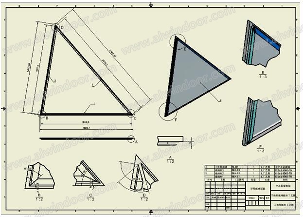 4. 將三維建模軟件中的參數(shù)自動關(guān)聯(lián)到機(jī)械設(shè)計(jì)軟件后,自動生成三角形玻璃框的組框圖、型材加工圖等,詳見圖11和圖12,同樣,不同的三角形玻璃框板塊加工工藝只需改變板塊編號即可完成;