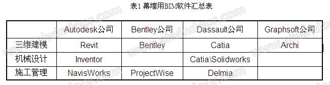 目前,幕墻行業(yè)常用的BIM軟件詳見表1,它們主要被應(yīng)用于幕墻工程的招投標(biāo)階段、施工圖過程中的三維建模和幕墻工程施工管理階段。然而,在設(shè)計(jì)下料階段,僅有為數(shù)不多的幕墻公司采用專業(yè)的機(jī)械設(shè)計(jì)軟件進(jìn)行幕墻設(shè)計(jì),使得BIM技術(shù)在建筑幕墻行業(yè)中的作用沒有得到充分發(fā)揮。