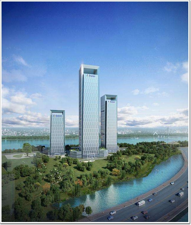 楷林國際大廈地處長沙市湘江新區濱江金融中心核心區域,總占地50.91畝,總建面28萬平方米,總投資30億元。項目由3棟超高層建筑組成,由美國凱里森負責建筑設計,三棟樓的外形設計完全一樣,每個單體為正方體“口”字形,三棟樓擺在一起形成獨特的“品”字造型,當然,這是俯視效果,從正面看,建筑整體又構成一個“山”字,非常有創意。