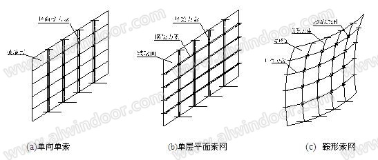 用以支承玻璃幕墻的索結構其索結構形狀的布置和索系的確定,可以根據具體工程項目確定,應考慮到邊緣結構的承受力和穩定性。
