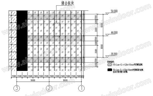 參考上海幕墻地方標準,影響幕墻撞擊荷載取值的兩大主要因素是單片玻璃的面積和在防護欄桿高度部位有無橫梁。如果按照幕墻的常見分格寬度尺寸在1.5米左右考慮,單塊玻璃面積不大于4平方米就意味著玻璃分格的高度尺寸不超過2. 7米,一旦超過這個尺寸,有關撞擊計算取值相應提高,所以實際上幕墻玻璃做全落地的設計不是一個好的做法。比較理想的情況是在防護欄桿的高度位置設置橫梁,不僅實實在在地提高了幕墻的耐撞擊安全性,也提高了使用者的安全感受。當然,也有的做法是將橫梁位置提高,與設置在梁底的高窗分格統一,對室內視野影響也不大。這種做法一定程度減小了單塊玻璃的面積,因此也提高了玻璃的耐撞擊能力。