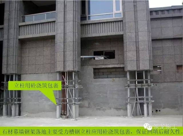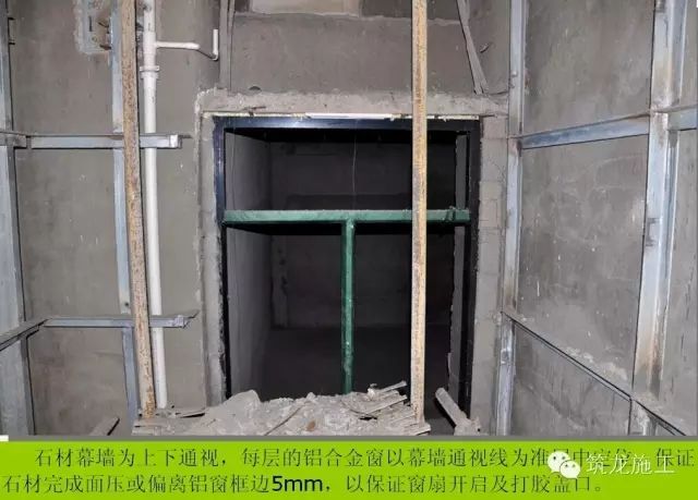 2、再按幕墻設(shè)計中的完成面外皮尺寸要求,根據(jù)石材在橫梁上的安裝距離,以及橫梁在立柱上的安裝距離,定位立柱離墻距離。點這免費下載施工技術(shù)資料
