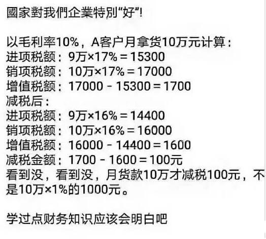 同樣的道理,如果你公司也是別人的供應(yīng)商,那是不是就意味著你的銷項下降了,那你的客戶很有可能也會跟你說:17%降到16%了,我們來談一談價格吧。