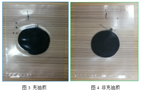 按照上述推薦方法做好后,等待數(shù)小時(shí),一般在24小時(shí)內(nèi),密封膠有沒有充油就能予以鑒別。密封膠如有充油,與之接觸的塑料薄膜會(huì)收縮起皺,而不充油的密封膠即使放置更長(zhǎng)時(shí)間,與之接觸的塑料薄膜都不會(huì)收縮起皺。圖1、3中與硅酮密封膠接觸的塑料薄膜收縮起皺,可判定膠樣充油;圖2、4中與硅酮密封膠接觸的塑料薄膜無(wú)收縮起皺,可判定膠樣不充油。