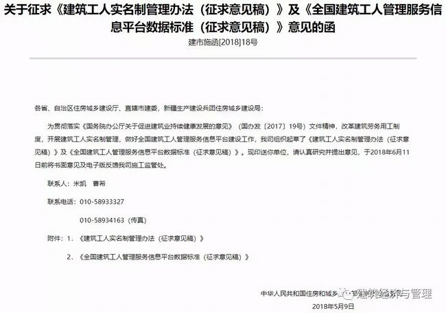 函件指出,為貫徹落實《國務院辦公廳關于促進建筑業持續健康發展的意見》(國辦發〔2017〕19號)文件精神,改革建筑勞務用工制度,開展建筑工人實名制管理,做好全國建筑工人管理服務信息平臺建設工作,住建部建筑市場監管司組織起草了《建筑工人實名制管理辦法(征求意見稿)》及《全國建筑工人管理服務信息平臺數據標準(征求意見稿)》。現印送各省、自治區住房城鄉建設廳、直轄市建委,新疆生產建設兵團住房城鄉建設局征求意見。
