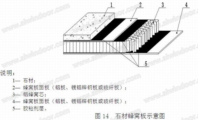 石材蜂窩板是由天然石材(詞條“天然石材”由行業大百科提供)薄板與蜂窩板經膠粘劑粘接復合而成的高科技產品。其飾面石材(詞條“飾面石材”由行業大百科提供)薄板幾乎可以是任何品種的石材,如花崗巖、大理石、砂巖和石灰石等。蜂窩板主要包括了采用鋁蜂窩作為芯材的鋁蜂窩板、鋼蜂窩板、玻纖蜂窩板等。石材蜂窩板的結構見圖14和圖15: