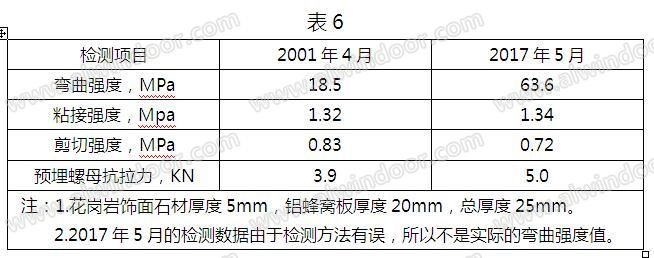 石材蜂窩板通常采用改性環氧樹脂作為膠粘劑,其耐久性是可靠的。我國首座采用石材蜂窩板作為幕墻外裝飾材料的的超高層建筑陜西電信網管大廈(圖16),完工于2001年,經過十七年的使用,從現場拆卸的板塊依舊保持完整和良好的性能,見圖17和表6。
