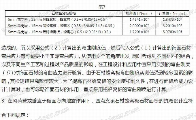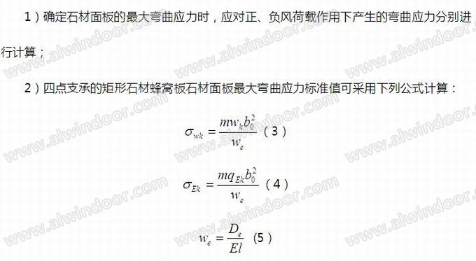 1.為防止石材蜂窩板飾面石材在風荷載和其它作用的作用下產生細小裂紋或斷裂而影響石材蜂窩板的耐久性能,在判定和計算石材蜂窩板面板承載力時,應將飾面石材開始產生細小裂縫時的承載值作為石材蜂窩板彎曲破壞的極限承載值,而不是將整板所能承受的最大值作為石材蜂窩板彎曲破壞的極限承載值。盡管飾面石材斷裂后石材蜂窩板整體并未產生任何安全問題,且蜂窩板仍然可繼續承受更大的荷載直到蜂窩芯產生失穩或整板斷裂等。