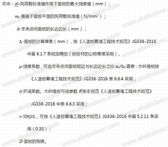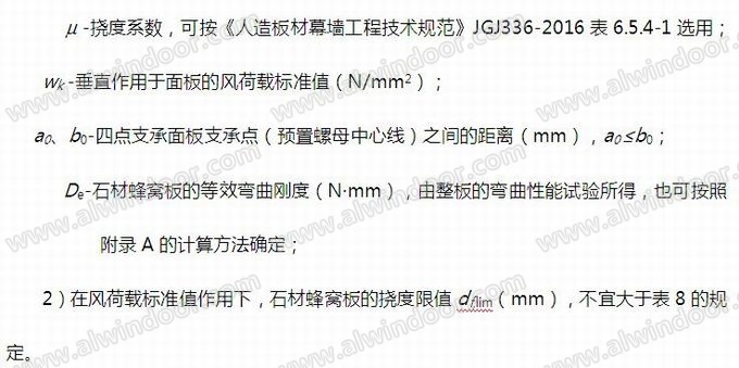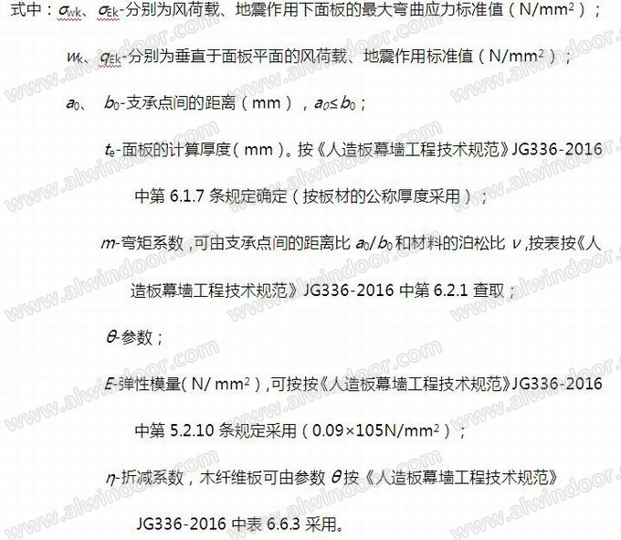 2)面板中由各種荷載和作用產生的最大彎曲應力標準值應按《人造板幕墻工程技術規范》JG336-2016中第5.4.1條的規定進行組合。組合后的彎曲應力設計值不應超過面板材料的抗彎強度設計值f。