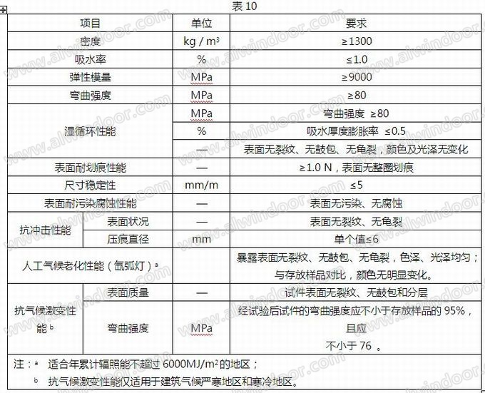 建筑幕墻用高壓熱固化木纖維板具有良好的理化和力學性能,表10為板材的理化力學性能要求,抗灣強度高、沖擊抗力高、耐熱沖擊、耐老化和耐腐蝕是板材的顯著特點。