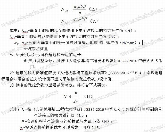 1)在垂直于面板平面的風荷載或地震作用下,單個連接點的拉力標準值宜采用有限元方法分析計算。按周邊對稱布置的矩形面板,也可按下列公式計算: