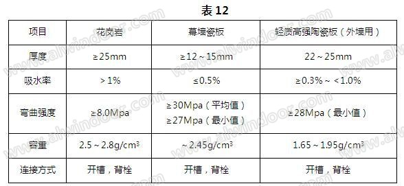 與現有建筑幕墻用瓷板相比,輕質高強陶瓷板具有較多的優點,具有更多的應用范圍和安全性。表12為輕質高強陶瓷板與相關幕墻用板的主要性能指標的比較。從表12中可以分析并得到以下結論: