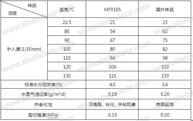 從全面性能對比表上可以看出,MF910S的各項性能與國外樣品相當,剪切強度也較大,能夠滿足中空玻璃生產的需求。