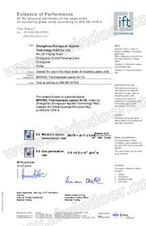 暖邊間隔條的誕生可改善中空玻璃的節能效果,特別是減少邊部的冷凝現象。但是由于環境溫度的變化,中空玻璃空腔內氣體始終處于熱脹或冷縮狀態,從而使密封膠長期處于受力狀態。氣體密封耐久性是測定中空玻璃老化前后的密封(氬氣濃度保持率)性能。經國際權威檢測機構檢驗,MF910S熱塑性暖邊中空玻璃能夠滿足EN1279關于中空玻璃性能測試的要求。下圖是MF910S暖邊中空玻璃的EN1279檢測報告。