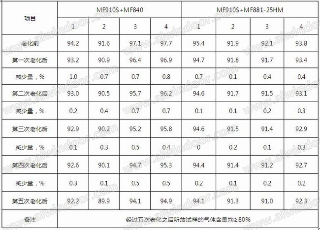 (2)MF910S熱塑性間隔條配套制作的暖邊中空玻璃的耐老化性能較強,經過五次氣體密封耐久性試驗之后,氣體的泄漏量較小,所放試樣的氣體含量均≥80%,能夠滿足GB/T 11944標準的要求。