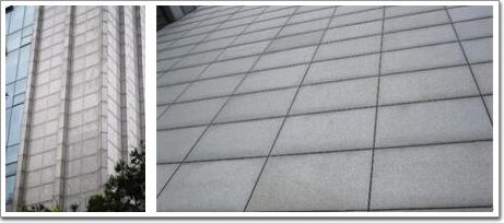 針對石材幕墻污染的現(xiàn)象,硅寶科技應用技術工程師對石材幕墻的選型進行了調查與分析。某項目在2009年完成建設,選用某品牌密封膠進行石材板片的密封。根據(jù)客戶反饋,在使用該密封膠后的幾個月內,并未出現(xiàn)幕墻污染的現(xiàn)象。但一年以后,該項目整個石材幕墻出現(xiàn)了大面積的污染,并且污染的現(xiàn)象越來越嚴重,嚴重影響了幕墻的美觀(如下圖所示)。因此,石材幕墻選用普通密封膠進行密封時,盡管短時間內不會出現(xiàn)污染的現(xiàn)象,但隨著時間的推移仍然會造成幕墻的污染。所以,石材密封必須要選用專用的石材密封膠,從根本上解決石材幕墻的污染問題。