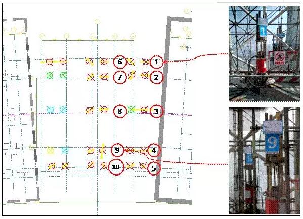 提升10根鋼絞線,提升一個行程為250mm,每個提升行程每根鋼絞線都存在相對誤差、液壓同步提升系統(tǒng)、纜風拉結(jié)、風速影響等都會造成提升過程產(chǎn)生誤差,通過液壓提升系統(tǒng)荷載誤差分析控制、全站儀精度測量、激光測距監(jiān)控數(shù)據(jù)綜合分析、提升鋼絞線伸出測量分析儀綜合測量糾偏調(diào)整,為防止累計誤差。