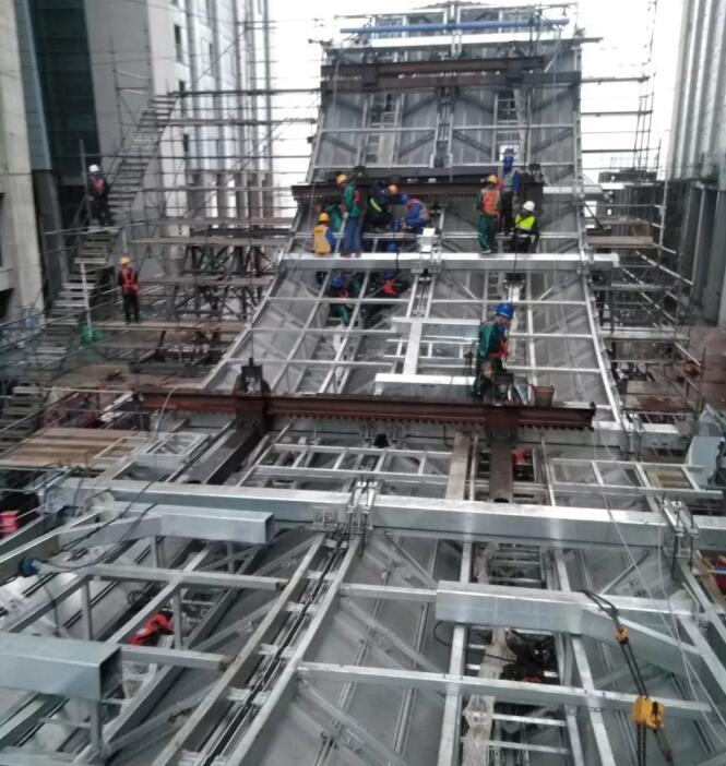 重量達到30噸的單元板塊在超高空5根軌道滑移,使用具有耐高溫的特點、摩擦系數(shù)極低聚四氟乙烯作為滑架和軌道之間的介質(zhì)。解決了滑移水平拉結(jié)摩擦力對鋼架變形的影響。