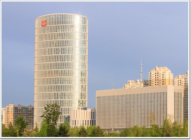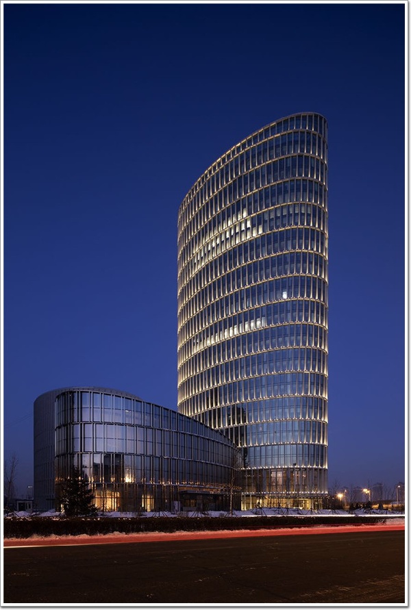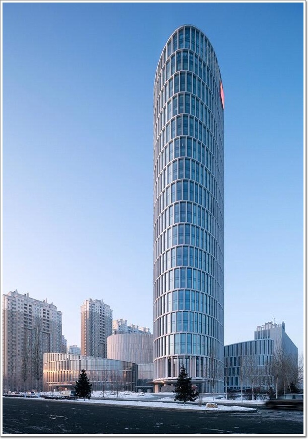 項(xiàng)目綜合體由4棟?rùn)E圓形建筑組成,分別為辦公樓、體育中心、接待中心和營(yíng)業(yè)大廳,兩層地下室連為一體,用作停車場(chǎng)、卸貨區(qū)。銀行總部建筑群體的高度控制給予綜合體一個(gè)平衡的視覺(jué)關(guān)系,銀行大廳設(shè)于24米高處。位于底層的入口大廳讓場(chǎng)地內(nèi)所有組成元素相互滲透,聯(lián)系緊密。餐廳、零售商店和咖啡館環(huán)繞建筑外圍而設(shè),進(jìn)一步強(qiáng)化了其社交中心的地位。與此同時(shí),松花江的壯麗景色也盡收其眼底。