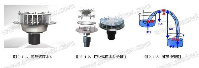 在CECS183:2005 《虹吸式屋面雨水排水系統技術規程》術語中規定,虹吸式屋面雨水排水系統:按虹吸滿管壓力流原理設計,管道內雨水的流速壓力等可有效控制和平衡的屋面雨水排水系統。一般由虹吸式雨水斗(如圖2.4.1~2.)、管材(連接管、懸吊管、立管、排出管)、管件、固定件組成。