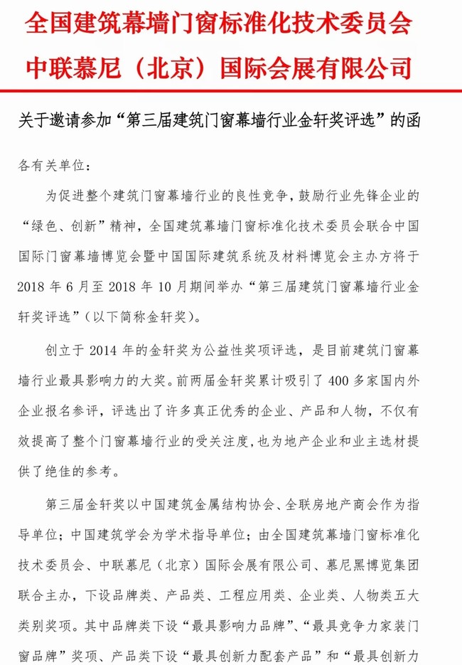 6月23日,第三屆建筑門窗幕墻行業“金軒獎”面向全行業正式啟動!