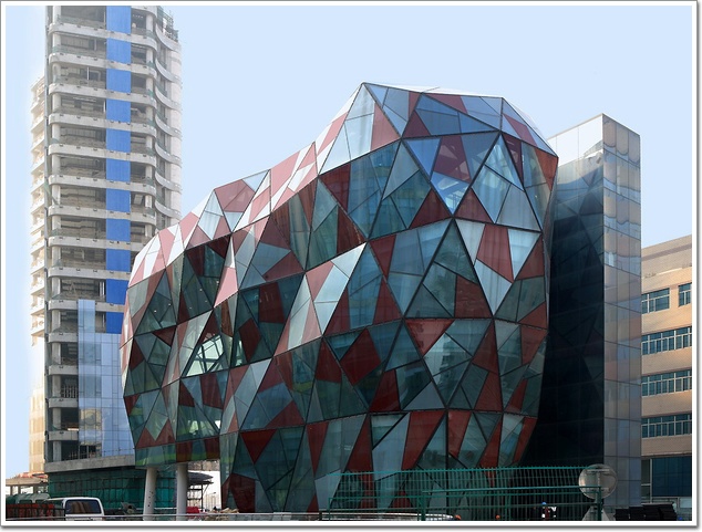 10號樓整體造型以鉆石為原型,外型設計獨特多變,全部采用玻璃幕墻設計,幕墻類型為框架式玻璃幕墻,建筑總高20米,幕墻面積4600平米。