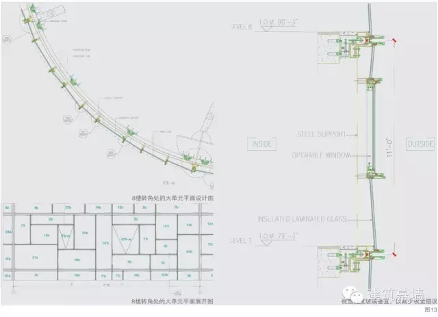 一個位于八層轉角處的大單元(圖 13),總長 36 英尺 9 英寸半(約合 11m),高 11 英尺(約合 3.3m),內有 17 個小單元,最大玻璃板塊 2 620mm×1 460mm,最長玻璃 3.3m×1.0m。有 12 種不同規格、15 種不同角度、8 種不同的配置,兩個開啟扇。這個單元在工廠做好后重達 8t,要用一個 40 英尺長的開頂貨柜單獨裝載,運輸過程中固定它的鋼材就達 4t,這個單元板塊上下各 4 組預埋件固定在層間樓板上,由于是彎曲板塊,所有位置都在三維測量下施工。設計時必須清楚表示玻璃板塊的角度、大小以及兩大板塊之間的接合,工廠加工同樣要使用三維定位,才能夠減少安裝時誤差。設計師還叮囑在視覺高度上盡量讓玻璃角度垂直,以減少視覺錯誤和不舒適的感覺,這也讓我們感覺到建筑設計的人文關懷是通過一個個細節來實現的。