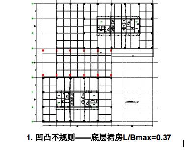 因?yàn)檎麄(gè)平面的旋轉(zhuǎn),部分位置的懸挑長(zhǎng)度很大,可能需要驗(yàn)算豎向地震作用,裂縫和撓度也要嚴(yán)格控制。比如下圖,底部幾層的角部,懸挑非常大。