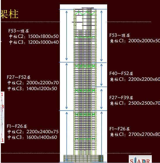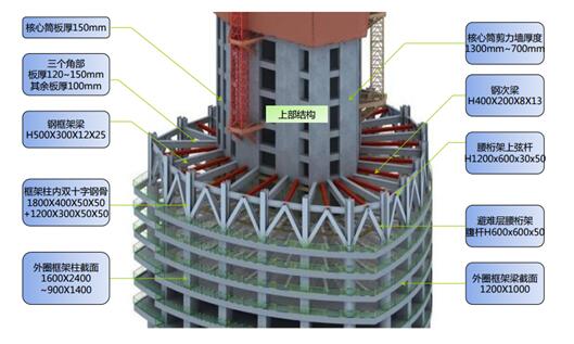 核心筒外圍剪力墻厚度,底部為900mm,四層以上為700mm,鋼管混凝土柱外徑約為1300mm~ 1450mm,柱子的豎向傾斜隨建筑立面傾角約1 -6度。