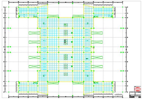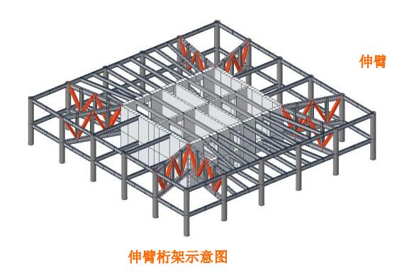 4、伸臂桁架,建筑16、32層,每個加強層X、Y向分別設置四道伸臂,伸臂采用高度等于層高的桁架連接核心筒和外圍框架柱。
