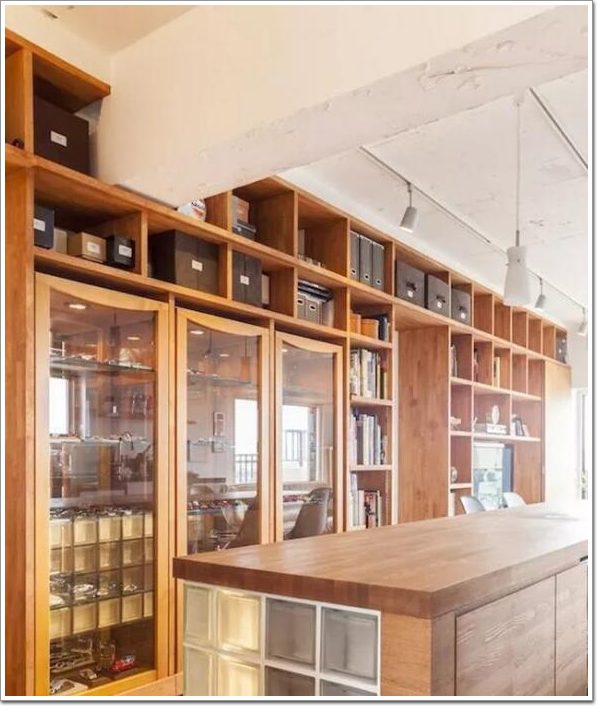 在櫥柜的上方設置玻璃窗,雖然采光變好了,也會擔心玻璃上噴濺的水漬和油漬會影響廚房外部的美觀度,而玻璃磚就不會有這方面的困擾,即便內側的玻璃有點污漬,經過雙層玻璃的折射,外部也依舊閃亮亮的,看不出來▼