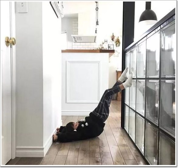也可以將玻璃磚鋪在輕質隔墻的下方,營造出一種墻壁懸浮的錯覺,用在玄關和客廳的隔斷處,從客廳透過的燈光也可以作為玄關的補充照明▼