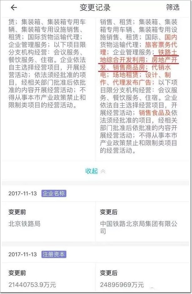 查詢了下鐵總下屬中國鐵路北京局集團有限公司的資料,最新工商信息變更登記記錄顯示,經營范圍多了“鐵路土地綜合開發利用,房地產開發,銷售商品房”等內容。