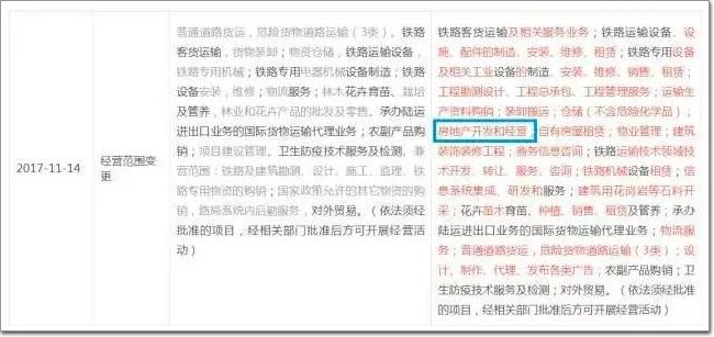 這是一家企業2017年11月14日變更經營范圍“公示信息”的截圖(點擊可放大查看),很明顯,這家企業新增了“房地產開發和經營”。而它原來的主營業務是:鐵路客貨運!