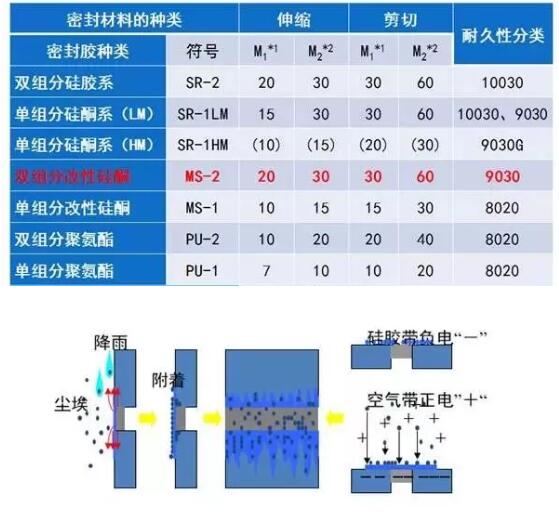◆位移變形:在溫度位移情況下的設計伸縮率20%、剪切形變率30%;風荷載及地震引起位移的情況下設計伸縮率30%、剪切形變率60%;均優于單組分/雙組分的聚氨酯密封膠和常見的單組份硅酮密封膠,見下表:
