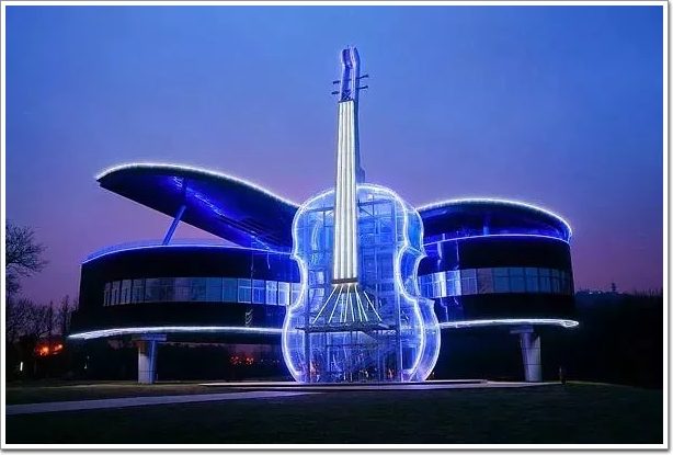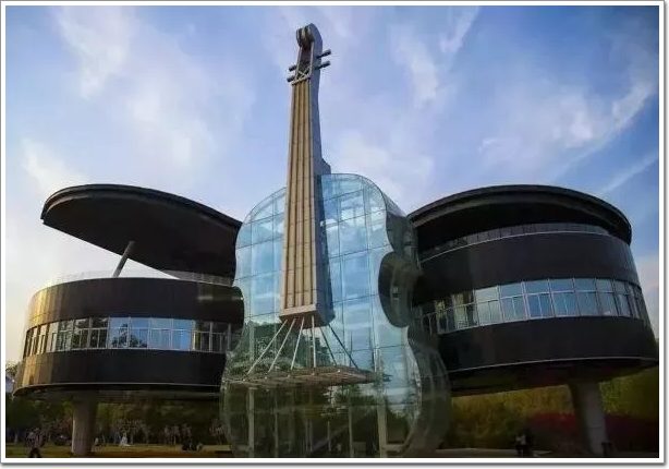 這一架“鋼琴”坐落在安徽淮南新城區,建筑主體為黑色鋼琴造型,樓梯則設計成透明提琴造型。這架“鋼琴”占地1100平方米,最高處16米,均由透明的玻璃和鋼結構組成。