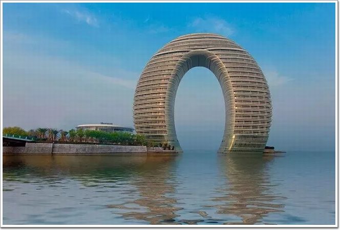 湖州喜來登酒店,它像一個倒U狀的馬蹄,類似于傳統中國畫中描繪的舊橋,很有創意。