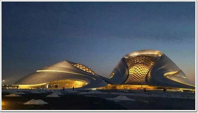 哈爾濱大劇院是哈爾濱標志性建筑,依水而建,與哈爾濱文化島的定位和設計相一致,體現北國風光大地景觀的設計概念。