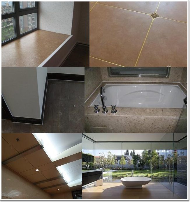 2. 各類柜臺、窗臺、家具等縫隙,櫥柜、廚房等各類邊角,瓷磚、臺面、天花吊頂及墻板工程的裝修填縫密封;浴缸、坐便器、洗手盆、淋浴房等衛生潔具和洗菜盆、水槽等廚房潔具的安裝及防水、防霉密封處理;室內石材與石材之間、石材與其它材料之間的防污染填縫密封(見圖2)。