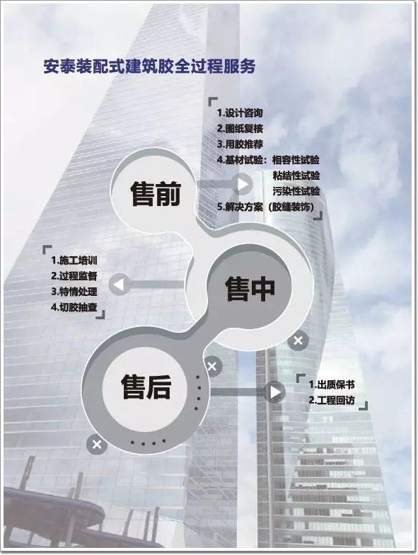 售中:在施工前,安泰建筑膠技術團隊將會為施工隊進行培訓,在打膠過程中實時監督,針對種種特殊情況,安泰建筑膠技術團隊實時提供專業指導,確保產品最終使用效果合格。施工時,安泰建筑膠技術團隊將硅酮結構膠打在工程用的基材料頭上,與制作幕墻板塊放在一起養護,達到養護時間后,每批結構膠和鋁材、玻璃在施工時都要現場做簡易的粘結性試驗、隨批剝離粘結性試驗及單元件切膠,以確保整個幕墻系統的安全。