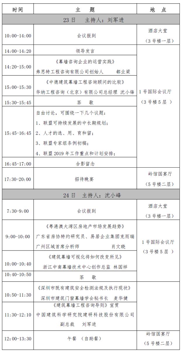伴隨著建筑業進入深層結構性調整,產品創新和技術升級已是勢在必行,為了更好地推動建筑幕墻技術進步與創新、提高建筑幕墻的安全保障,實現建筑幕墻與主體建筑設計 的無縫對接,重新整合社會資源,構建新型產業鏈關系,打造房地產開發商、設計院、顧問公司、幕墻施工企業和建材生產企業全產業鏈溝通平臺,中國建筑金屬結構協會鋁門窗 幕墻委員會自2014年開始,已連續召開4屆全國建筑幕墻顧問行業聯盟座談會,歷屆參會代表百余人并給予座談會高度認可,面對2018年建筑業新態勢,我委員會擬定于2018年11月23一24日在廣州市白云國際會展中心召開第五屆全國建筑幕墻顧問行業聯盟座談會,歡迎各位代表的出席!
