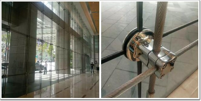 廣州東塔總建筑面積50.77 萬平方米,建筑高度530米。群樓單根單向索結(jié)構(gòu)點式幕墻跨度25m,采用了堅朗φ85不銹鋼拉索和400系列駁接爪。