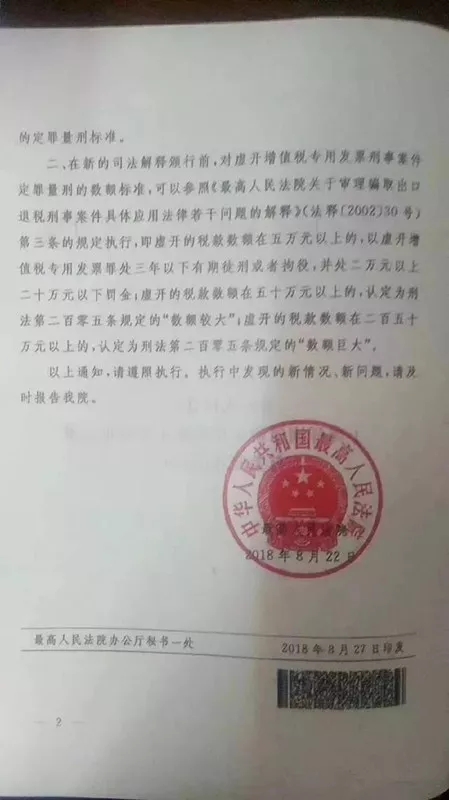 2018年8月22日 ,最高人民法院發(fā)布了關(guān)于虛開增值稅專用發(fā)票定罪量刑標(biāo)準(zhǔn)有關(guān)問題的通知。(下文有文字版)