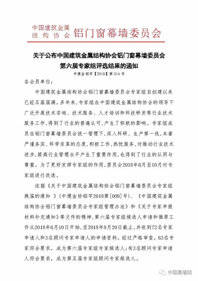 現將中國建筑金屬結構協會鋁門窗幕墻委員會第六屆專家組名單予以公布,具體名單見附件。