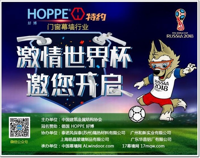七月:開啟“門窗幕墻行業『2018 世界杯』競猜贏驚喜”活動,共同見證2018足球冠軍誕生!為豐富門窗幕墻行業人士的看球文化,中國幕墻網 ALwindoor.com 聯合“德國HOPPE好博”發起 “2018世界杯”競猜贏驚喜活動,讓您的行業生活不再單調!