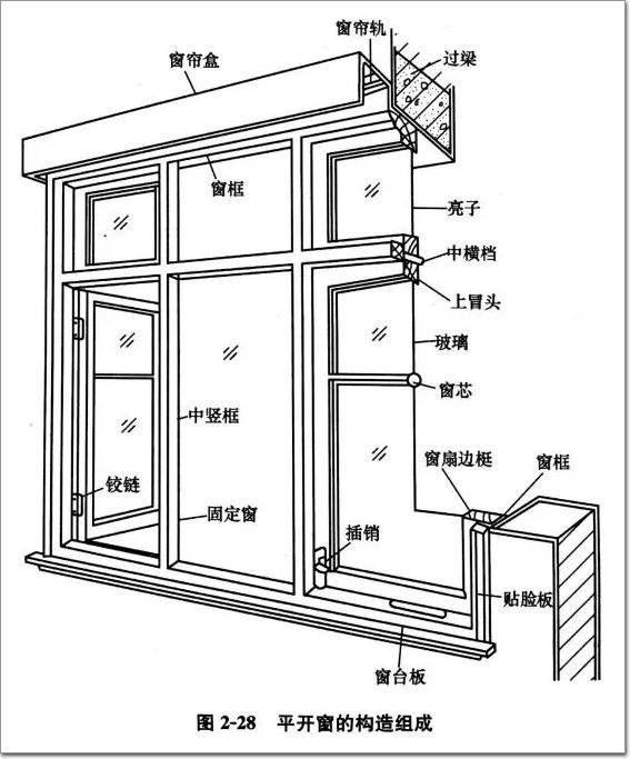 窗由窗框、窗扇和五金零件組成。窗框?yàn)闉楣潭ú糠郑蛇吙颉⑸峡颉⑾驴颉⒅袡M框和中豎框構(gòu)成;窗扇為活動(dòng)部分,由上冒頭,下冒頭、邊梃、窗芯及玻璃構(gòu)成;五金零件及附件包括鉸鏈、風(fēng)鉤、插銷和窗簾盒、窗臺(tái)板、筒子板、貼臉板等。下圖是平開窗的構(gòu)造組成。